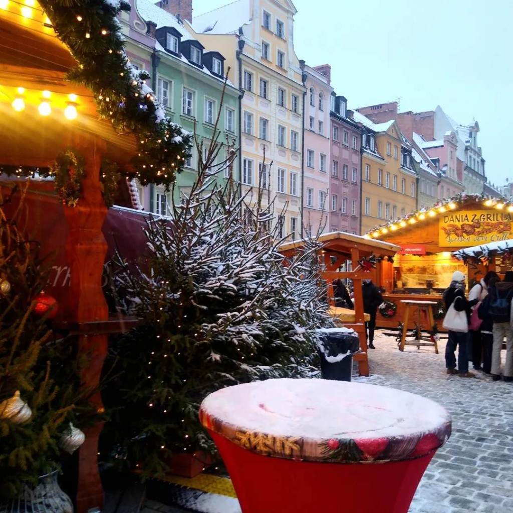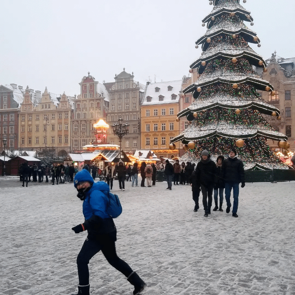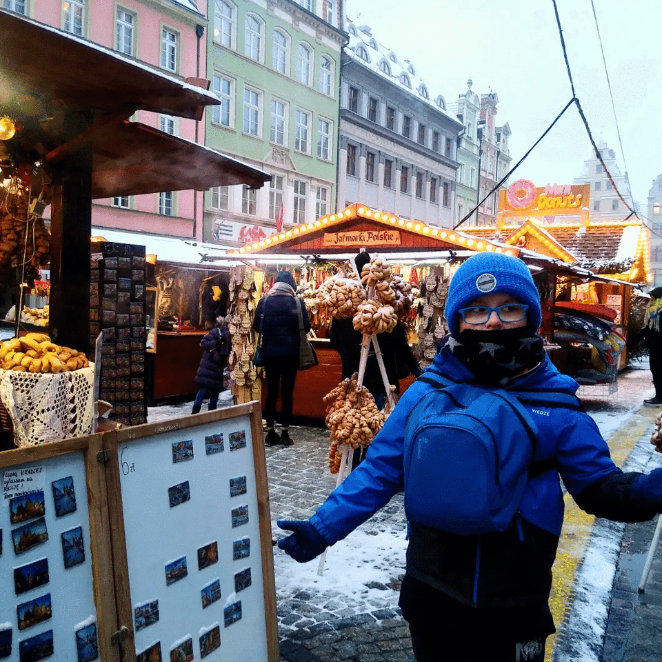 Podobno wrocławski jarmark bożonarodzeniowy jest najładniejszy w Polsce ;). Rzeczywiście – kiedy nie ma tłumów, które nie pozwalają doświadczyć tego klimatu, poczuć w sobie blask i niepowtarzalną świąteczną atmosferę, jarmark na rynku wrocławskim jest wręcz pochłania. Można się w nim zatracić. My mieliśmy to szczęście, że przez cały pobyt padał śnieg. Zrobiło się naprawdę przyjemnie… 🙂